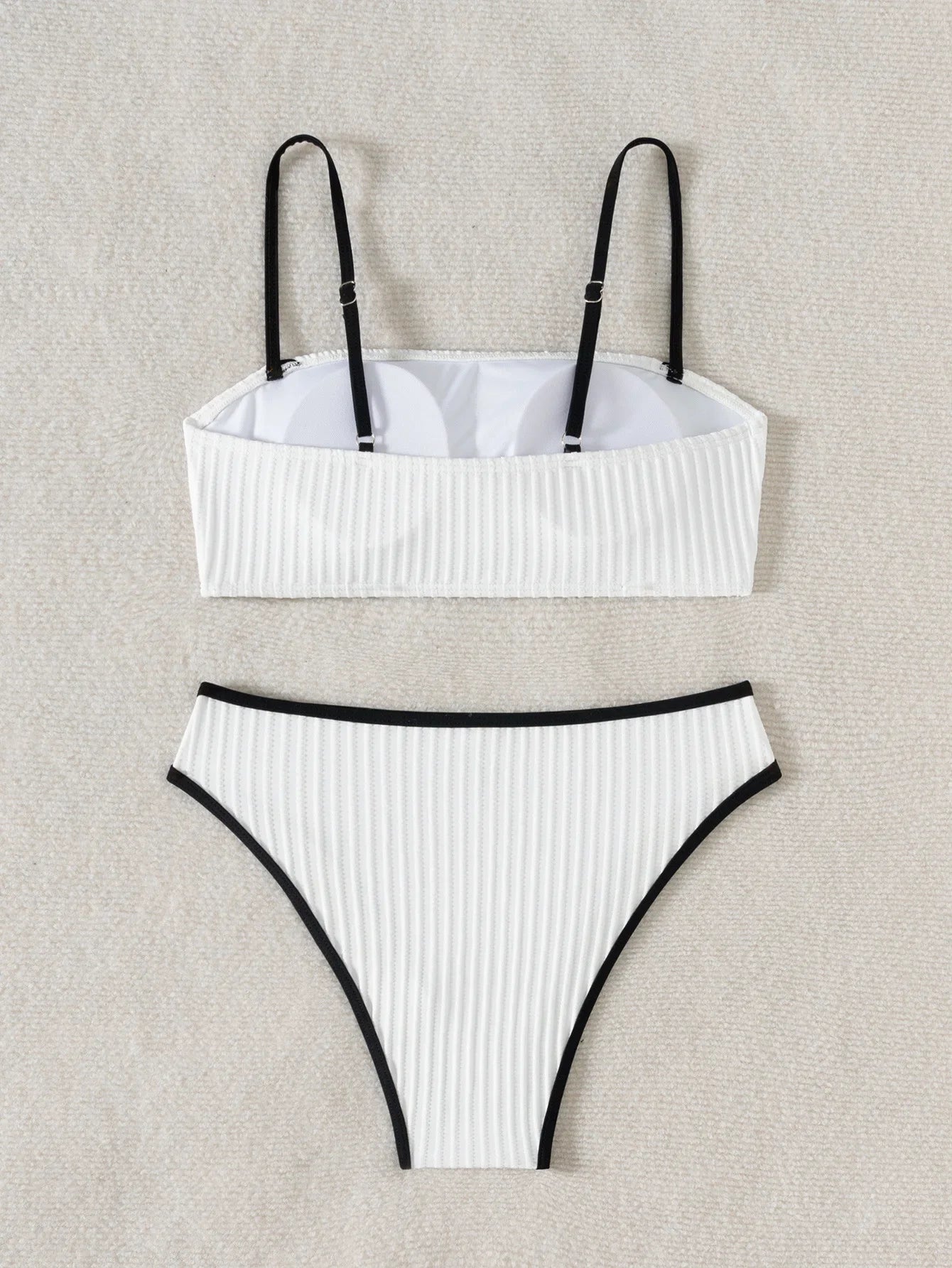 2025 Rib Piping Bandeau High-Rise Bottoms Bikini Set Trendy Beachwear Straight Neckline High Rise Swimwear Swimsuit Bathing Suit