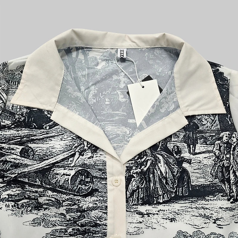2025 Spring Summer Women Vintage Printed Party Evening Mini Dresses Long Sleeves Loose Lapel Short Shirts Dress