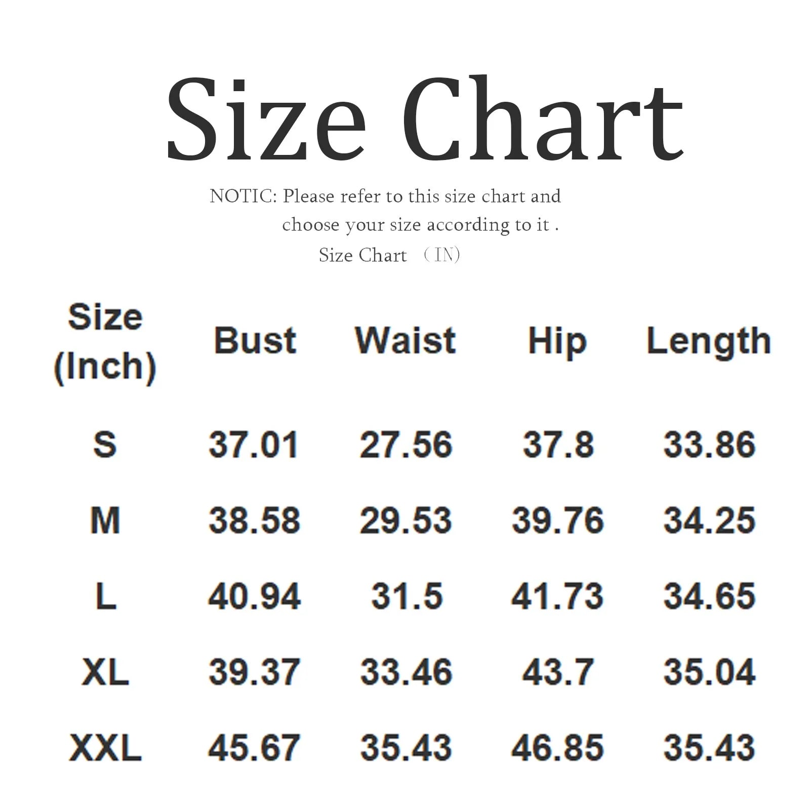 SizeBustWaistHipLengthS94cm/37.01''70cm/27.56''96cm/37.80''86cm/33.86''M98cm/38.58''75cm/29.53''101cm/39.76''87cm/34.25''L104cm/40.94''80cm/31.50''106cm/41.73''88cm/34.65''XL100cm/39.37''85cm/33.46''111cm/43.70''89cm/35.04''XXL116cm/45.67''90cm/35.43''119cm/46.85''90cm/35.43''
